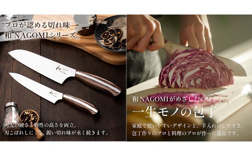 「和 NAGOMI」の三徳包丁は切れ味が鋭く、ハンドルに段差がないので手とひとつになる様なグリップ感。