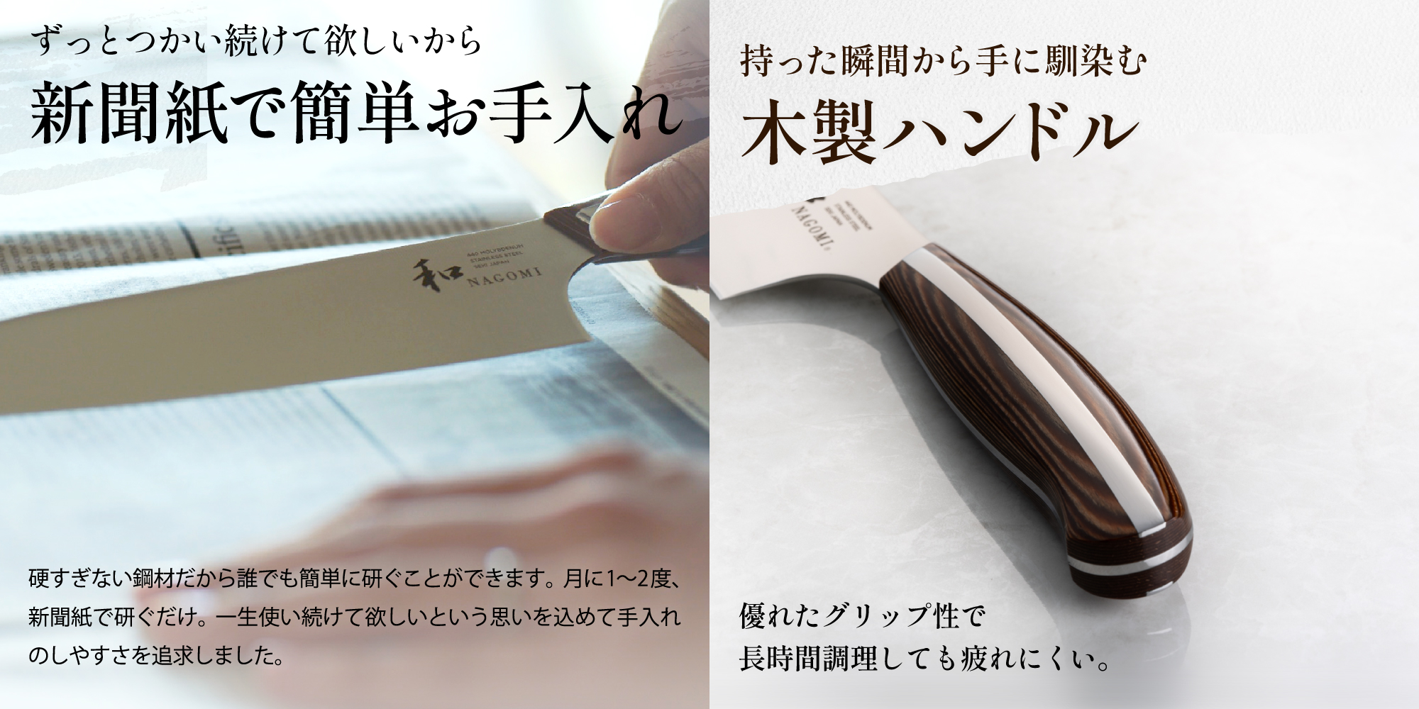 私たちが目指したのは、プロの料理人が納得する切れ味でありながら手入れが楽で、一般のご家庭でもずっとお使いいただけるような包丁です。