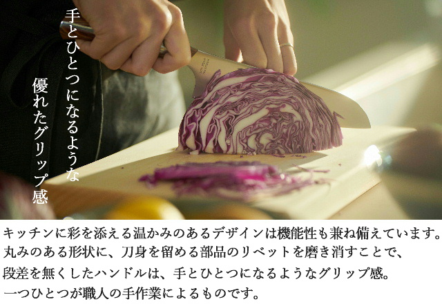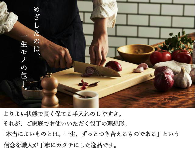 私たちが目指したのは、プロの料理人が納得する切れ味でありながら手入れが楽で、一般のご家庭でもずっとお使いいただけるような包丁です。