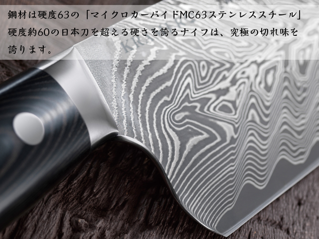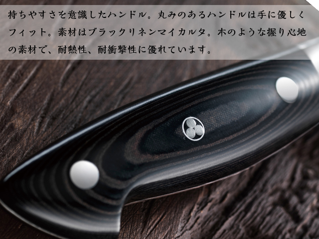 【素材】 ・鋼材:MC63スチール(マイクロカーバイド MC63ステンレススチール。硬度約63。極めて微細で均一な分子構造は、スムースな切れ味と耐久性を実現) ・ハンドル:ブラックリネンマイカルタ(繊維を樹脂で硬化させた木のような握り心地の素材で、耐熱性、耐衝撃性に優れています) |