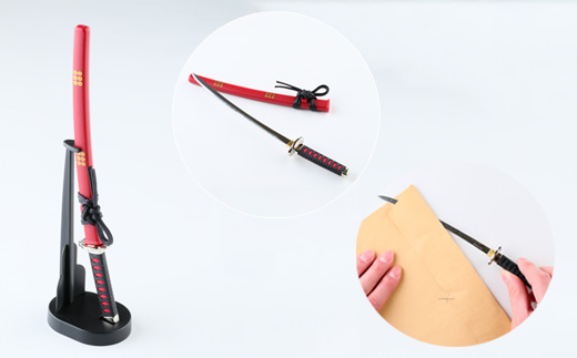 日本刀はさみ真田幸村モデル1丁(掛け台付き)、日本刀ペーパーナイフ真田幸村モデル1本(掛け台付き) 【サイズ】 ・はさみ:225mm×107mm×25mm ・ペーパーナイフ:236mm×63mm×48mm 【重さ】 ・はさみ:113g ・ペーパーナイフ:75g |