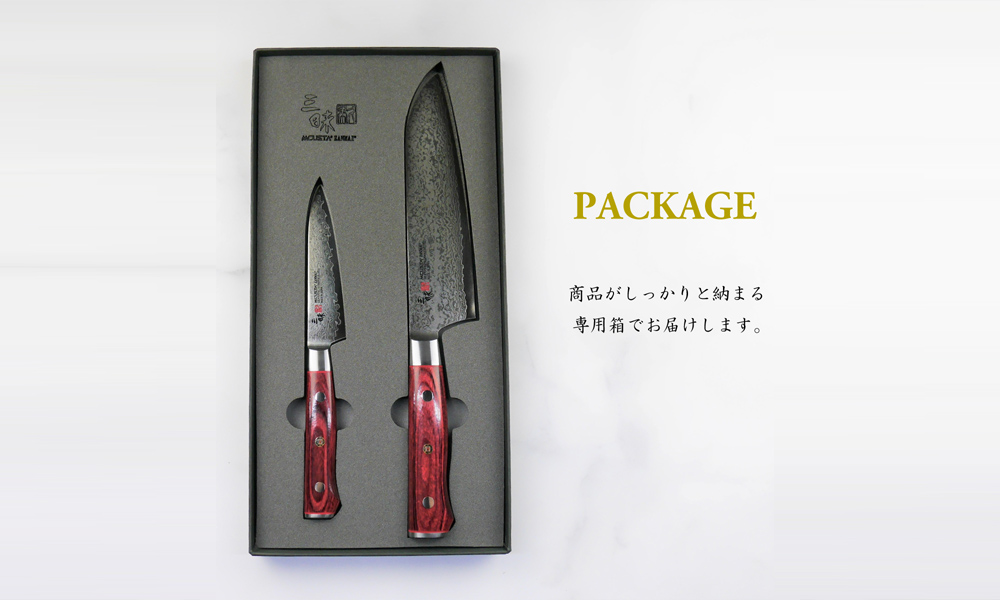 三昧シリーズの中で最も人気のあるシリーズの、三徳包丁とペティナイフの2本セットです。ハンドルは3D形状になっており握りやすく、尻金ではニンニクを潰したりする機能がついており万能な包丁です。ブレードは槌目を基調とした複雑な模様となっておりオンリーワンな商品に仕上がっております。
