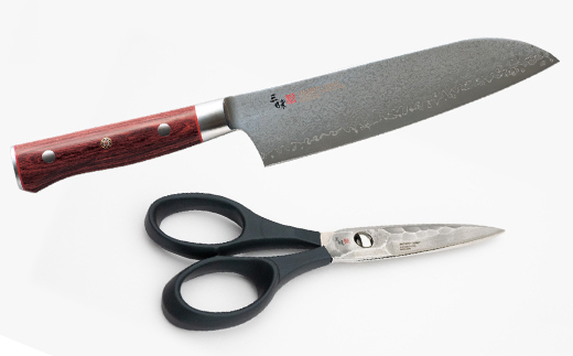 三昧シリーズの中で最も人気のあるシリーズの包丁とダマスカス鋼を使ったキッチンばさみのセット