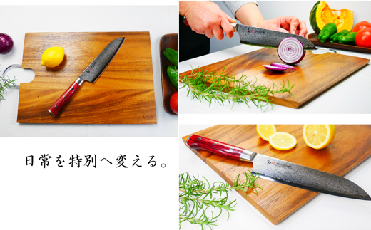 ・三昧シリーズの中で最も人気のあるシリーズです。ハンドルは3D形状になっており握りやすく、尻金ではニンニクを潰したりする機能がついており万能な包丁です。ブレードは槌目を基調とした複雑な模様となっておりオンリーワンな商品に仕上がっております。