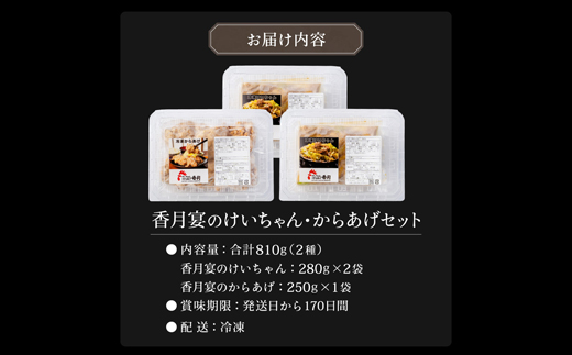 鶏ちゃん:280g×2袋、香月のからあげ:250g×1袋 【原材料】 ・鶏ちゃん:鶏もも生肉(ブラジル産)、キャベツ、清酒、?油、にんにく、ゴマ油、赤みそ、白みそ、和風だし、甜??、清涼飲料水、焼肉のたれ、唐辛子/調味料(アミノ酸等)、りんご酸、(一部に大豆・米・ごま・もも・りんご・乳成分を含む) ・香月のからあげ:鶏もも生肉(ブラジル産)、片栗粉、コーンスターチ、醤油、清酒、かつお節エキス、砂糖、昆布エキス、食塩/調味料(アミノ酸等)、甘味料(甘草、ステビア)、(一部に大豆・米・とうもろこしを含む) |