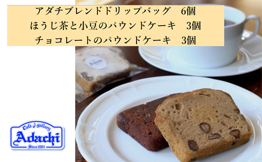 カフェ・アダチで一番人気のアダチブレンドのドリップバッグ珈琲6パック(6杯分)と、パティシエの作ったほうじ茶のパウンドケーキ3個と、チョコレートのパウンドケーキ3個の詰め合わせのセットです。ご家庭で簡単に専門店のコーヒーと、お菓子を楽しむことが出来ます。美味しいコーヒーと、コーヒーに最高に合う2種のパウンドケーキを味わってみて下さい。