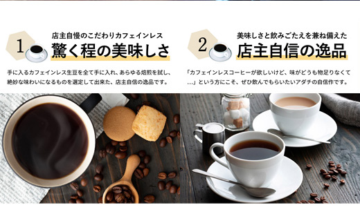 店主が日本一美味しいカフェインレスコーヒーを作りたく、日本で手に入るカフェインレスコーヒーの生豆をすべて手に入れ、あらゆる焙煎を試し、最高の味わいになるものを選定して作り上げました。自信があります。