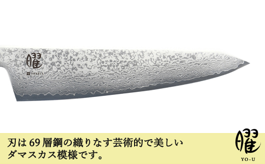 従来の古い感覚の包丁とは異なり、曜の切れ味や品質は継承し重さで切るのではなく、重く無くても良い素材と職人の鋭い刃付け加工で安定品質を保ちます。ブレード(刃)は69層鋼の織り成す芸術的で美しいダマスカス模様です。