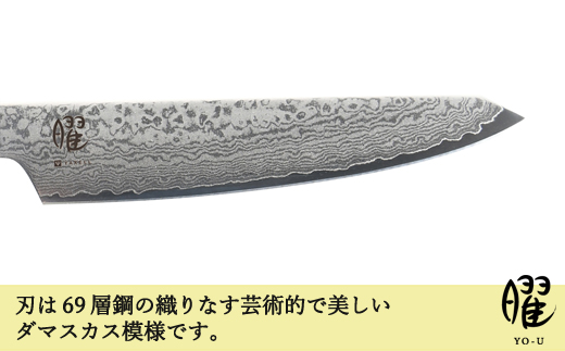 従来の古い感覚の包丁とは異なり、曜の切れ味や品質は継承し重さで切るのではなく、重く無くても良い素材と職人の鋭い刃付け加工で安定品質を保ちます。ブレード(刃)は69層鋼の織り成す芸術的で美しいダマスカス模様です。