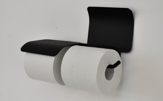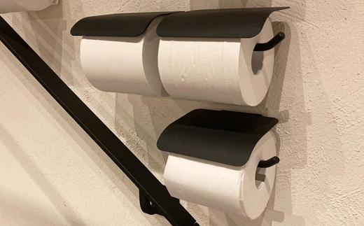 紙切板は鉄板に丸みをつけて、鉄ならではの重みでおさえられます。紙を差し込む部分は、丸いアイアンの棒の先端を少し曲げ、トイレットペペーパーが抜けおちないようなかたちになっています。丸みをおびた形は空間にあわせやすく、目を引くアイテムです。また、トイレットペーパーが2つ付けられて、紙切れの心配もありません。予備ストックがあるので、残りのトイレットペーパーを別の場所に保管でき、トイレの空間もすっきりさせることができます。