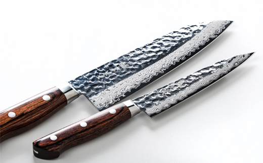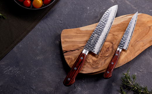 ・三徳包丁 【素材】刀身:V金10号割込み 柄:マホガニー ・ペティナイフ 【素材】刀身:V金10号鋼割込み 柄:マホガニー |