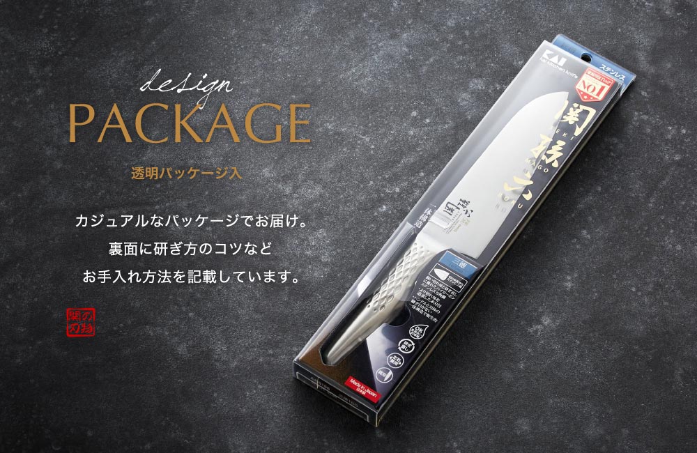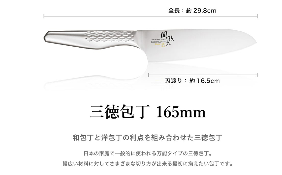 ・刃の形状は、肉・魚・野菜など様々な食材に万能に使用できる三徳タイプ