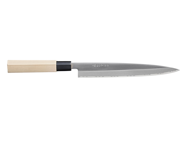 刺身包丁×1 【サイズ】全長:約32cm、刃渡り:約20.5cm 【重さ】約110g 【素材】 ・刃:高炭素刃物鋼(はがね) ・柄:白木 |