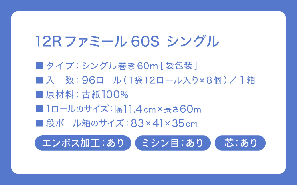 【タイプ】シングル巻き 60m 【入数】96ロール / 1箱 (1袋(12ロール入)×8) 【個包装】なし 【サイズ】幅114mm×長さ60m 【芯】あり 【ミシン目】あり 【エンボス(表面の凹凸)加工】あり 【原材料】古紙100% 【ケース箱サイズ】830×410×350mm |