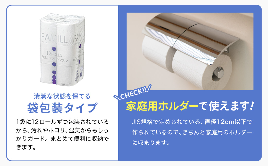 再生紙100%使用のトイレットペーパー シングル ファミール60m。