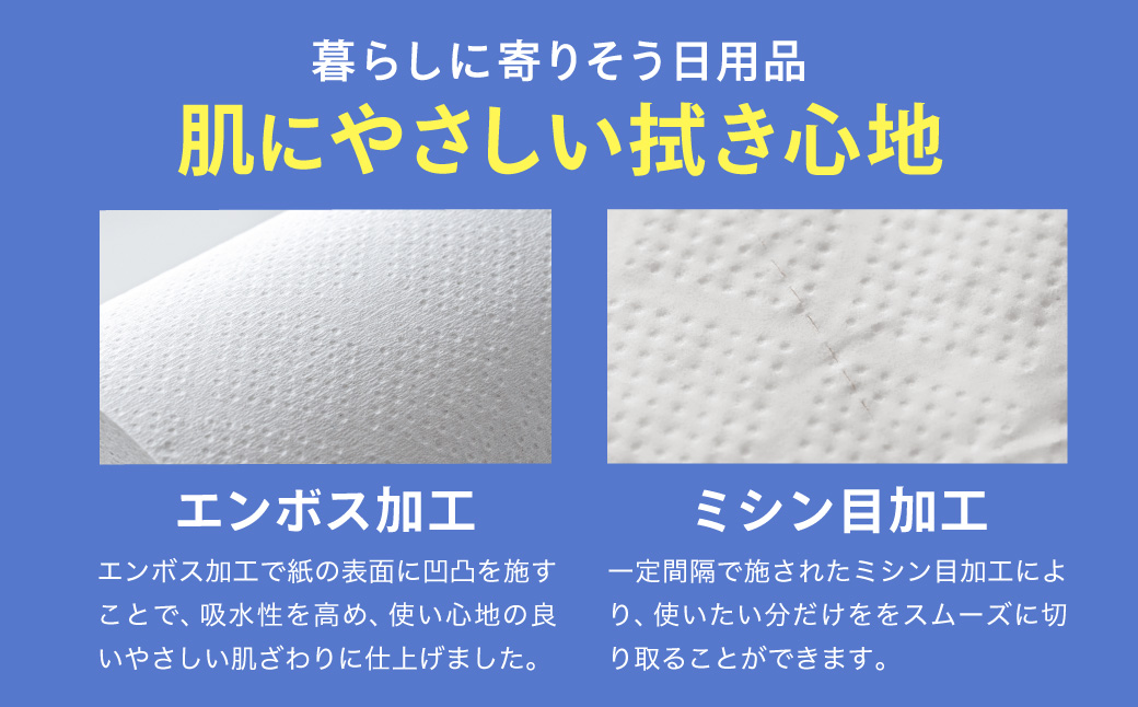 エンボス加工とミシン目付きで、やさしい拭き心地と使いやすさです。