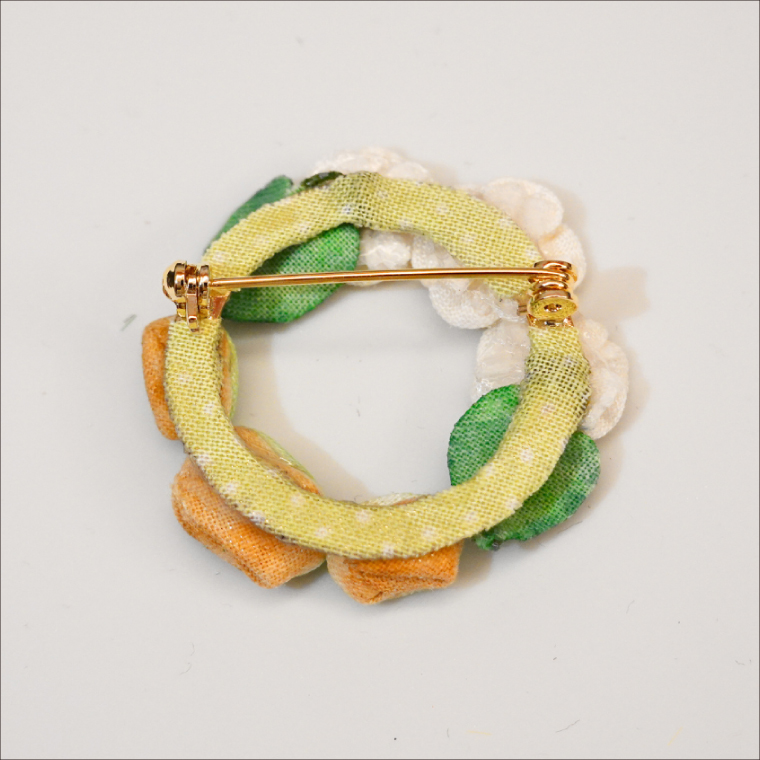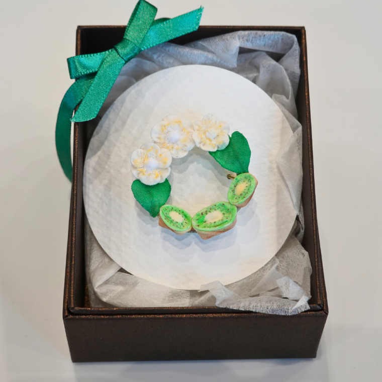 岐阜県関市・洞戸(ほらど)地区の特産品「ほらどキウイ」をモチーフにしたつまみ細工のブローチです。地元農産物の魅力を広めたいという思いから丁寧に制作しました。