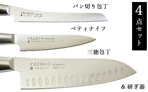 三徳包丁、パンナイフ、ペティーナイフ(ステンレス刃物鋼・18-0ステンレス) 研ぎ器(ダイアモンドホイール、ABS樹脂、シリコーン) |