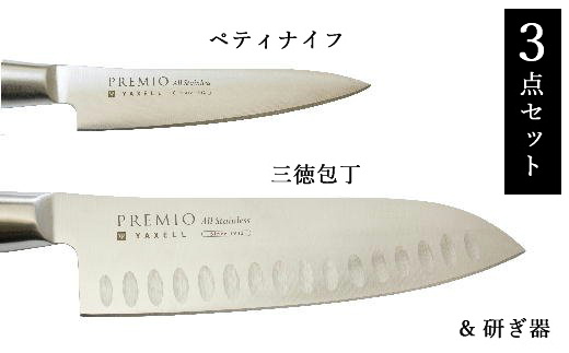 三徳包丁、ペティーナイフ(ステンレス刃物鋼・18-0ステンレス) 研ぎ器(ダイアモンドホイール、ABS樹脂、シリコーン) |