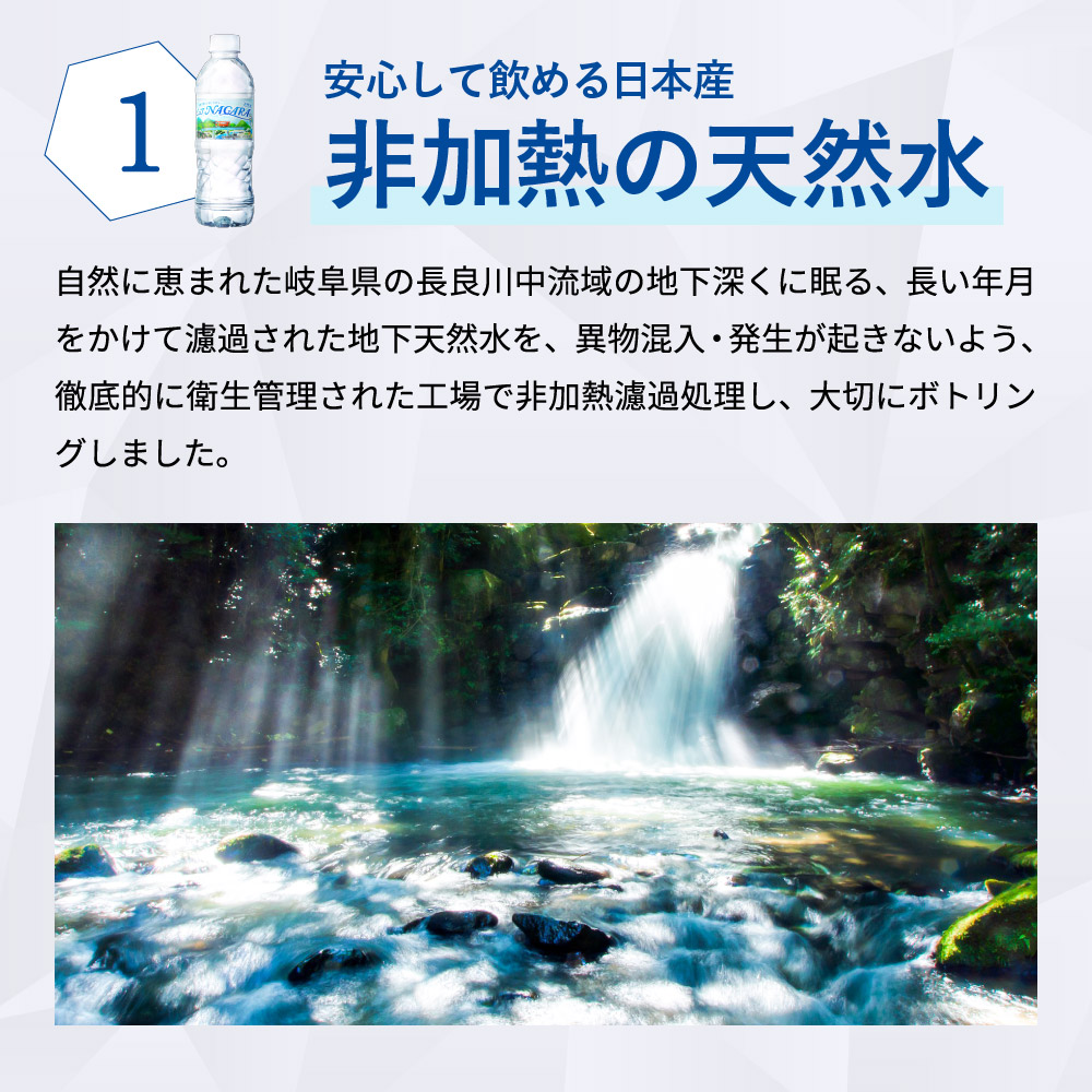 山々に囲まれ、自然に恵まれた岐阜県の長良川中流域。透明度の高さと水質の良さで、環境省の名水百選にも選定されています。その地下深くに眠る、長い年月をかけて濾過された地下天然水を、異物混入・発生が起きないよう、徹底的に衛生管理された工場で非加熱濾過処理し、大切にボトリングしました。非加熱なので、栄養成分をそのまま閉じ込めることができました。 カラダにいちばん近い水。