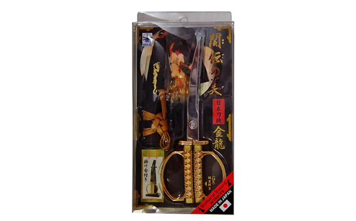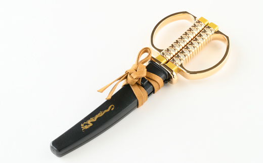 日本刀をモチーフとしたハサミで、刃体の反りや刃紋、柄などをリアルに再現しております。