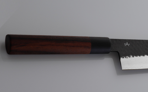 V金10ステンレス包丁「玄」、その名前が示す通り、金属の酸化物が作り出す独特の黒色と、ダマスカス模様が和の美しさと深みを感じさせます。