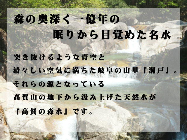 その清らかさの源となる高賀山から一億年の眠りを経て湧き出たナチュラルミネラルウォーターです。