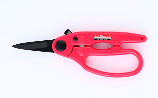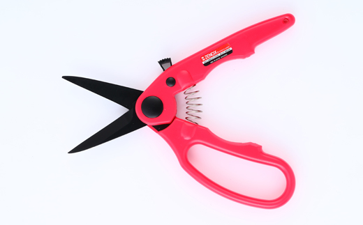 SKー4鋼にフッソ加工をして,錆びにくくコンパクトでかるく、手によくなじむ。バネ付きでハサミがいつも切れる状態で、親指と人差し指で使用できハサミを離さず作業ができる。便利なロックつきで、収納の時刃開かない